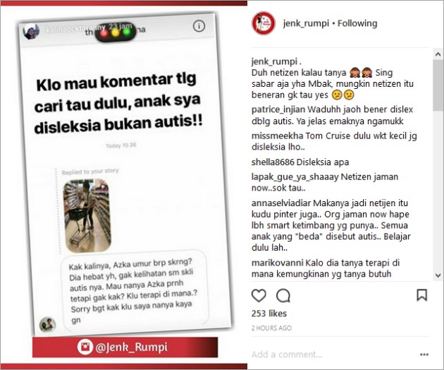 Waduhh jaoh bener dislex dblg autis. Ya jelas emaknya ngamukk,” komentar akun @patr*****ian. “Aduh , dyslexia ama autis beda kali mbak .. yg sabar ya mama azka,” tulis akun @ju*******y1.
