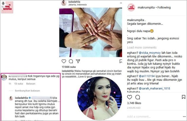 “Kita emang dah tua ibu soleha berhijab. Bersyukur kalo kulit tanganmu mulus,” balas Iis. “Repot amat ma hidup orang coba jangan cuma kepalamu yg ditutup benahi hati dan perkataanmu juga ya akan lbh baik.”