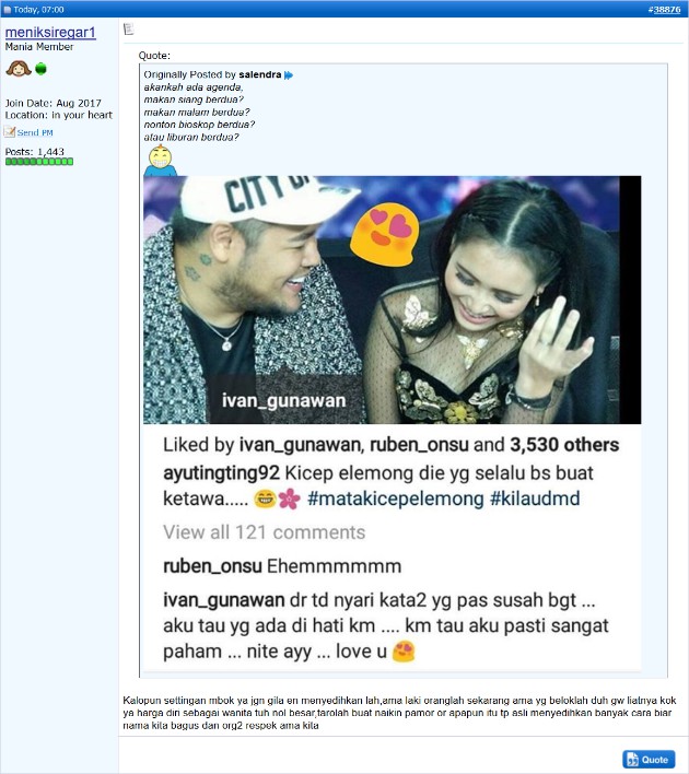 “Kicep elemong die yg selalu bs buat ketawa,” tulis Ayu. Ruben Onsu lalu muncul untuk mengomentari foto mesra itu.